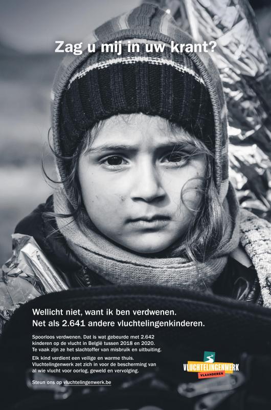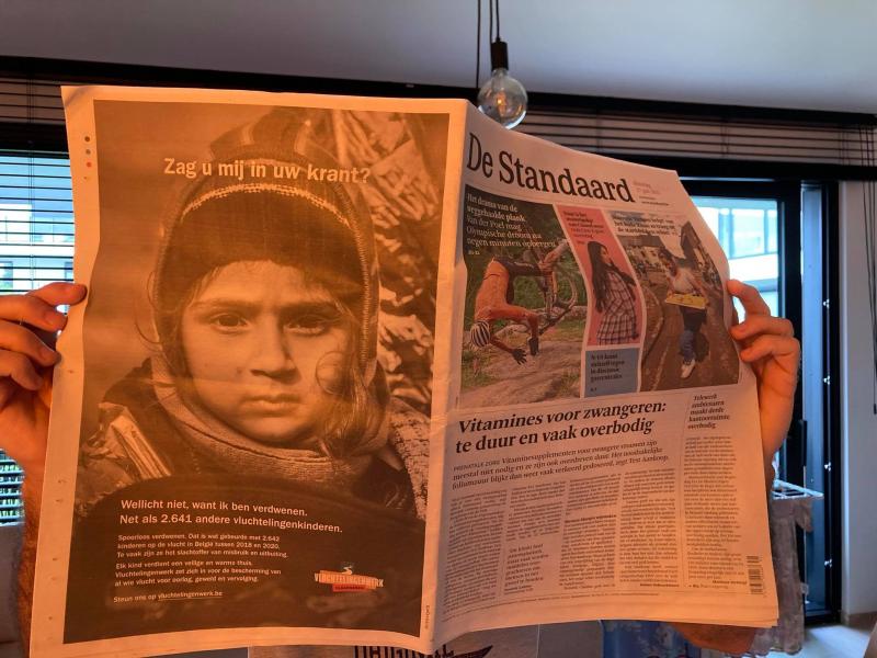 Onder de slogan 'Zag u mij in uw krant' vragen we met onze advertentie aandacht voor vluchtelingenkinderen. Tussen 2018 en 2020 verdwenen 2.642 kinderen op de vlucht spoorloos in België. Te vaak zijn ze het slachtoffer van misbruik en uitbuiting. Elk kind verdient een veilige en warme thuis.