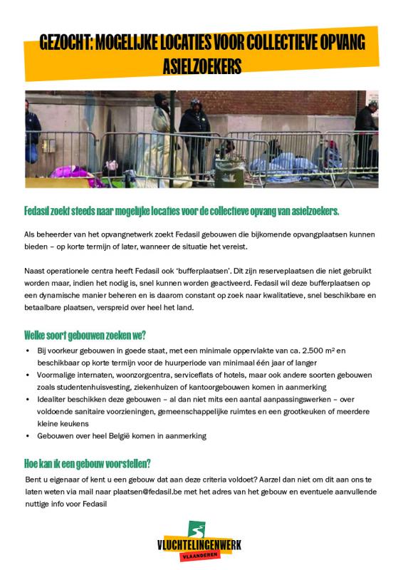 Fedasil zoekt steeds naar mogelijke locaties voor de collectieve opvang van asielzoekers.