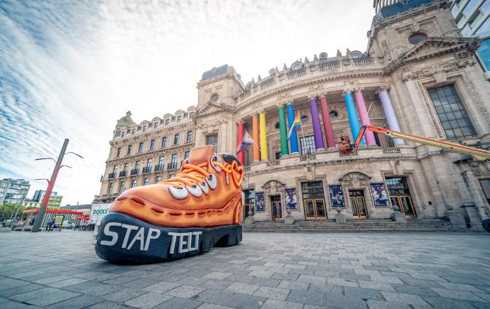 Wat doet deze reuzenwandelschoen in Antwerpen?